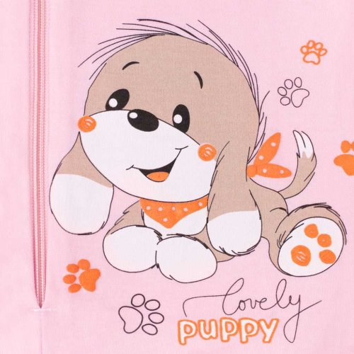 Bavlněný kojenecký spací pytel New Baby pro miminka v krásné pastelové barvě s veselým obrázkem pejska. Spací pytel je vhodný pro miminka už od narození pro svou jemnost a měkkost. Praktické zapínání na zip po celé délce. Složení: 100% bavlna.