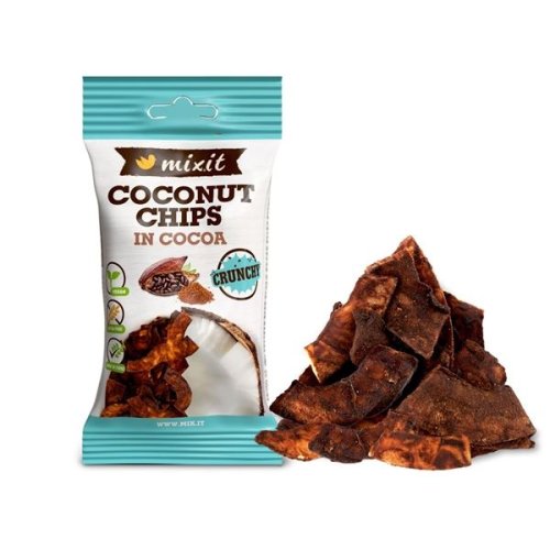 Mixit pražené kokosové chipsy s kakaovým práškem - balení do kapsy, chutná svačinka na cesty či do kanceláře