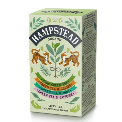 Kolekce zelených čajů značky Hampstead Tea London obsahuje výběr čistého zeleného čaje, zeleného čaje s mátou a lékořicí, zeleného čaje se zázvorem a citrónovou trávou a zeleného čaje s jasmínem a bergamotem