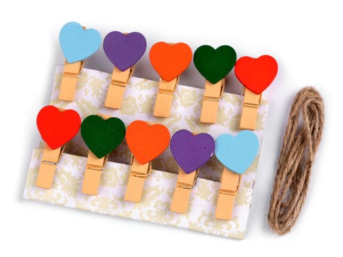 Dřevěné kolíčky se srdíčky v pestrých barvách se zalíbí především dětem a potěší i zamilované.Použití: Veselá dekorace oživí především dětské pokojíčky. Stačí jen natáhnout šňůrku a kolíčkem přichytit oblíbené fotografie vašich nejmenších. Také kresby, které vytvoří vaši malí umělci, najdou na šňůrce své místo. Dekorační kolíčky můžete použít k uchycení jmenovek při určování zasedacího pořádku u svatebního stolu.Balení obsahuje: kolíčky se srdíčkem, šňůrku o délce cca 100 cm Varianta č. 1 má v balení 12 ks kolíčků. Varianta č. 2 má v balení 10 ks kolíčků.