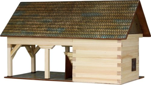 Dřevěná slepovací stavebnice Walachia - Kolna. Slepovací stavebnice Walachia jsou dřevěné modely domečků a staveb z Valašského kraje v měřítku 1:32. Základem jsou dřevěné hranolky 9x9 mm a k tomu jsou v sadě vždy všechny papírové doplňky - okna, dveře, střešní části atd. Pro lepení se používá lepidlo Herkules, není však součástí stavebnice. Přiložený je montážní návod a malé kapitoly z historie lidové architektury. Níže je označení obtížnosti číslem 1 - 5, přičemž 1 je nejlehčí. Rozměry: 34 x 18 x 19 cm. Počet dílů: 131. Obtížnost: 3