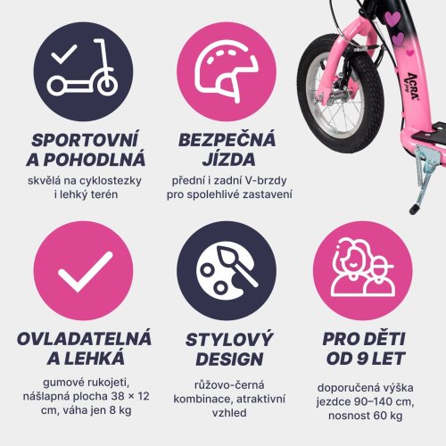 Usnadněte dětem cestu do školy, naplánujte s nimi výlet nebo se jen tak projeďte po okolí. Koloběžka Acra Joy Grace se hodí pro jízdu na silnici, cyklostezce i v nenáročném terénu. Potěší nejen pokročilé jezdce, ale také začátečníky. Je vhodná pro každého od 9 let s výškou až do 140 cm.