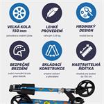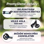 Koloběžka má kola z plastu a gumy s průměrem 150 mm. Je vybavená manuální zadní brzdou, brzdíte tedy nohou přes zadní blatník. Řídítka se pěnovými rukojeťmi se dětem pohodlně drží v ruce. Jednoduše je nastavíte podle výšky postavy.