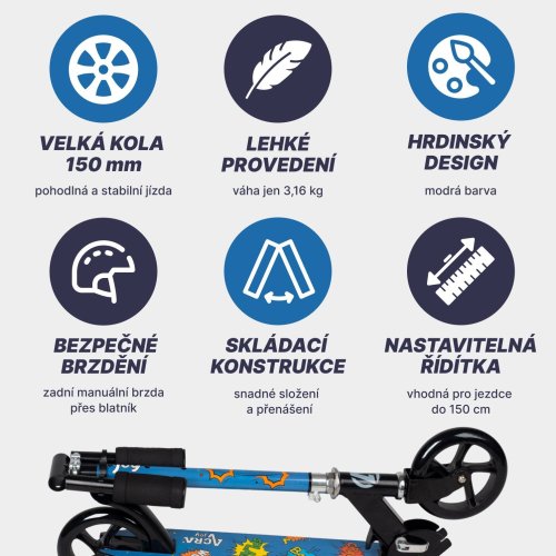Pořiďte svým ratolestem kompaktní koloběžku Acra Joy Superhero se skládacím rámem. Je vhodná pro děti od 6 let s výškou do 150 cm. Zvládne jízdu jak po silnici, tak v mírném terénu. Díky skládacímu provedení ji jednoduše přenesete nebo naložíte do auta. Navíc vám při skladování nezabere příliš místa. Kvalitní rám z odlehčené oceli uveze jezdce o hmotnosti do 100 kg. Design se zábavnými superhrdinskými motivy nadchne každé dítě.