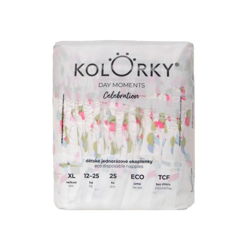 KOLORKY DAY MOMENTS jsou velmi tenké a jsou určeny pro každý moment s vašimi nejmenšími. Díky svému střihu neomezují miminko v pohybu. Jsou vyrobeny z přírodních a obnovitelných materiálů, neobsahují parfémy, ftaláty ani jiné škodlivé látky. Technologie Flash dry, zaručuje, že tekutina je rychle odvedena od pokožky miminka a pevně uzamyká v jádru nejen tekutiny, ale i zápach. Absorpční kanálky navíc zajišťují, že se tekutina rovnoměrně rozprostře po celém savém jádru a nehromadí se na jednom místě. Plenky mají také indikátor vlhkosti, který vám napoví, že je miminko potřeba přebalit. Design je plný barevných konfet a nese název Celebration, protože každý moment s vaším dítětem si zaslouží oslavit.