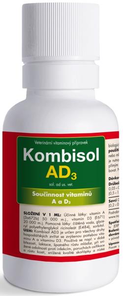 Problém: Při nedostatku vitaminu A dochází k omezení sekrece ochranného hlenu v dýchacích cestách a střevech, což zvyšuje náchylnost k zánětu plic a střev. Následná porucha funkce epitelových buněk odpovídá funkci příslušných orgánů, kde se epitel nachází. Při nedostatku vitaminu D dochází ke snížení úrovně ukládání minerálních látek do rychle rostoucích kostí u mláďat, což vede k jejich deformaci nebo zvýšené lámavosti. U dospělých zvířat se nedostatek vitaminu D projevuje demineralizací kostí, což způsobuje měknutí (osteomalácie) nebo řídnutí (osteoporóza). U drůbeže způsobuje nedostatek vitaminu D špatnou kvalitu skořápek. Všechny tyto stavy značně ovlivňují parametry užitkovosti zvířat. Složení: vitamin A 50 000 m.j., vitamin D3 20 000 m.j. Způsob aplikace: Kombisol AD3 se přidává do pitné vody nebo mléka preventivně v doporučené dávce po dobu 5 – 10 dnů. Roztok je nutno připravovat denně čerstvý, chránit před přímým slunečním světlem a co nejrychleji spotřebovat. Nepodávat neředěný přípravek! Dávkování: