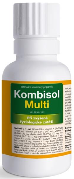 Problém: Při zvýšené fyziologické zátěži dochází v organismu k porušení vnitřního prostředí a jsou nastartovány metabolické procesy, které vedou k jejímu obnovení. Mnohé pochody jsou řízeny hormony, které vyžadují pro svoji syntézu vitaminy. Jejich nedostatek nebo nesprávná hladina takto snižuje užitkovost. Složení v 1 ml: vitamin A 5 000 m.j., vitamin D3 500 m.j., vitamin E 20 mg, cholinchlorid 100 mg, niacinamid 10 mg, D-panthenol 5 mg, vitamin B2 3 mg, vitamin B1 3 mg, vitamin B6 2 mg, vitamin K 1 mg, biotin 0,015 mg, vitamin B12 0,005 mg. Způsob aplikace: Kombisol Multi se podává zvířatům řádně rozředěný v pitné vodě nebo mléce. Preventivně po dobu 5 – 15 dnů v uvedených dávkách. Aplikaci lze opakovat po 3 – 4 týdnech. Roztok je nutno připravovat denně čerstvý, chránit před přímým slunečním světlem a co nejrychleji spotřebovat. Nepodávat neředěný přípravek! Dávkování: