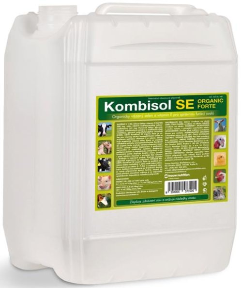 Problém: Nízká hladina selenu v krmných surovinách a adekvátní potřeba vitaminu E v období intenzivního růstu nebo vysoké užitkovosti zvyšuje nároky na jejich doplnění do krmné dávky. Složení v 1 ml: vitamin E 200 mg, selen (hydroxyanalog selenomethioninu) 0,2 mg. Způsob aplikace: Kombisol SE organic forte se podává zvířatům řádně rozředěný v pitné vodě nebo mléce. Lze jej použít preventivně po dobu 3-7 dnů v uvedených dávkách, aplikaci lze opakovat po 8 týdnech. Roztok je nutno připravovat denně čerstvý, chránit před přímým slunečním světlem a co nejrychleji spotřebovat. Nepodávat neředěný přípravek! Dávkování: