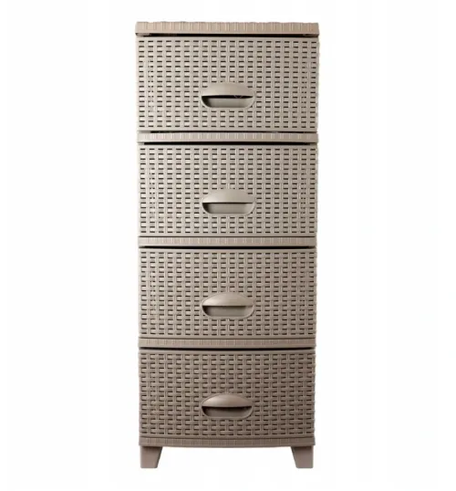 4 patrová komoda vyrobená z plastové elegantní imitace ratanu. Vhodná do koupelny, dětského pokoje. ložnice, garáže, dílny, skladu apod. kamkoli, kde je klíčový pořádek a styl! Zesílená konstrukce – zvýšená stabilita, trvanlivost a odolnost. Pevný materiál – odolný vůči vlhkosti, bez zápachu a snadno se čistí. Ratanový styl – přírodní vzhled, který doplní jakýkoli interiér. Lehká a praktická – snadno se přenáší kamkoli. Samostatná montáž – vše, co potřebujete, je součástí balení! Rozměry komody 37.5 x 44.5 x 94 cm. Barva kapučíno. EAN 8697806191326 / 0000040690704