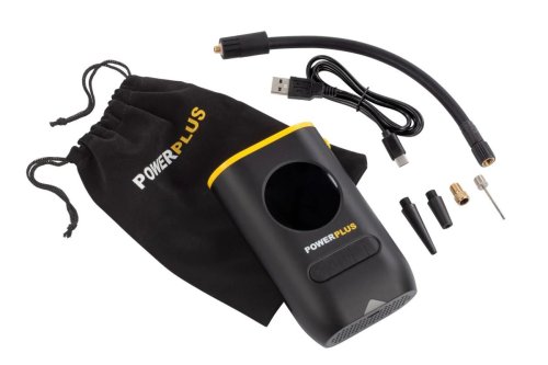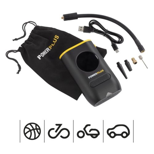 Ruční akumulátorový kompresor PowerPlus POWX1710 slouží pro rychlé dofukování rozličných obručí motorových vozidel a jízdních kol, nafukovacích lodí a raftů, hraček či sportovních míčů všeho druhu, kdy je dodáván se 4 praktickými adaptéry pro konkrétní aplikace. Spojka vzduchové hadičky může být použita u motocyklů a některých jízdních kol přímo i bez užití adaptéru.