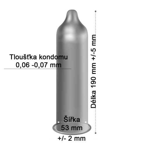 Rozměry: celková délka kondomu: 18 cm nominální šířka kondomu: 5,3 cm tloušťka stěny: 0,06 až 0,07mm