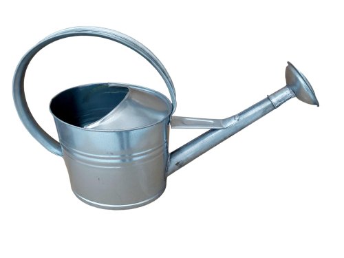Pozinkovaná konev s kropítkem. Objem: 10 l. Výška: 38 cm, šířka: 62 cm, hloubka: 28 cm.