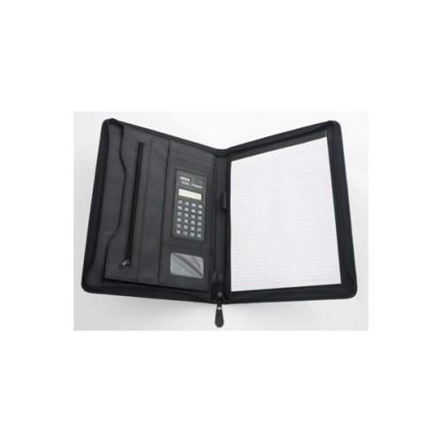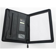 Konferenční desky z černé syntetické kůže uzavíratelné na zip Obsahují přihrádky na psací potřeby, dokumenty a vizitky Součástí je poznámkový blok a kalkulačka Barva: černá