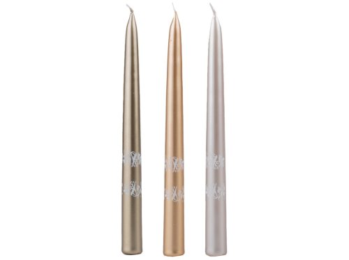 Kónická svíčka o rozměru 22×230 mm s jemným dekorativním potiskem větvičky v různých barevných variantách. Jednotlivé svíčky jsou dodávány v mixu, motivy a odstíny se mohou lišit.