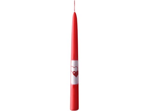 Kónická svíčka v červené barvě se srdíčkovým motivem, vhodná pro romantické příležitosti. Její rozměry jsou 22 x 230 mm.