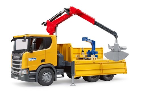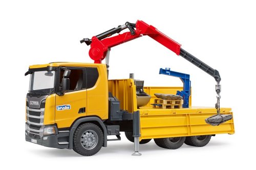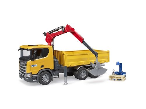 Pohodlné a robustní vozy BRUDER představují ve své nabídce řadu Scania Super R. Řada R se vyznačuje jedinečnou kombinací pohodlí a odolnosti. S novými modely od firmy BRUDER si děti mohou realisticky prožít různé situace. Nová kabina se vyznačuje typickým dynamickým designem vozů Scania. K dispozici jsou sklopná vnější zrcátka a otevíratelné dveře. Karoserie vozidla se skládá z výklopné ložné plochy se třemi skládacími bočními stěnami. Za kabinou řidiče je umístěn o 360° otočný, výklopný a teleskopický nakládací jeřáb, kterým lze volně pohybovat rukou a který lze uzamčením aretačního zařízení udržet v libovolné poloze. Kromě toho jsou na bocích nakládacího jeřábu namontovány výsuvné a spustitelné podpěry, které zajišťují větší stabilitu vozidla při nakládání. Protože jsou součástí balení také paletové vidle se dvěma paletami a drapák s lžící, hra může okamžitě začít. Vyrobené z vysoce kvalitních plastů, jako je ABS. Měřítko 1:16. Lze použít pro hru uvnitř i venku. Rozměry auta: 27 x 18,5 x 55 cm. Rozměry balení: 30,5 x 19,5 x 58,5 cm. Věk: 4+