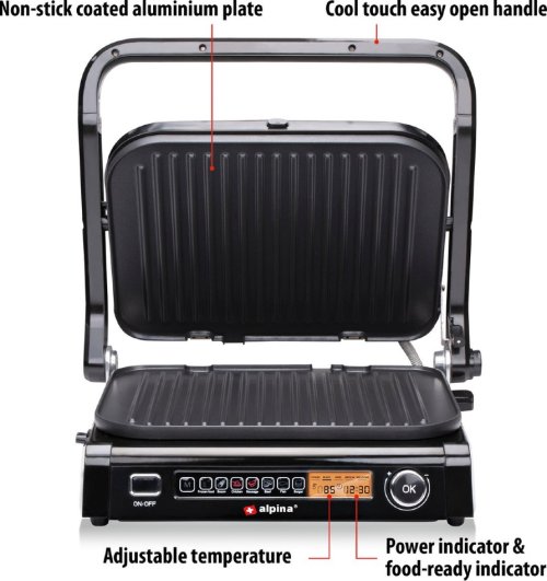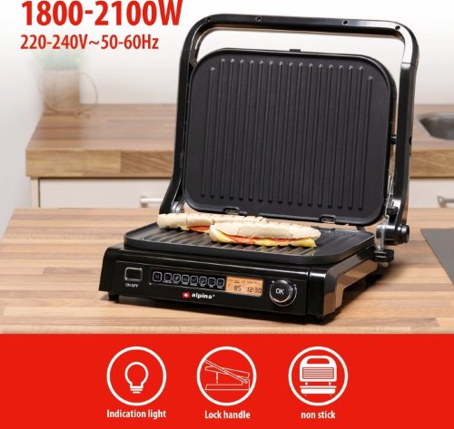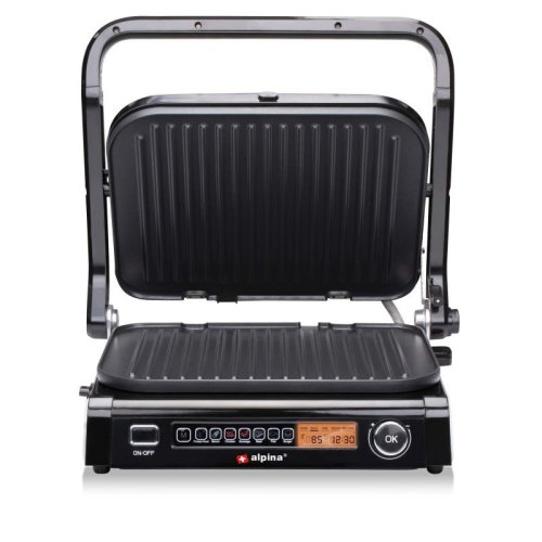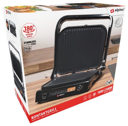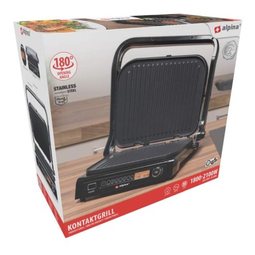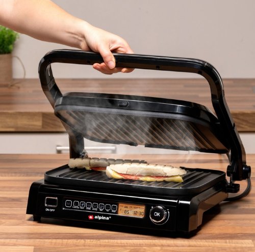 S tímto multifunkčním kontaktním grilem od alpina můžete připravit mnoho různých produktů jednoduchým způsobem. Díky různým grilovacím režimům a režimu Smart Cooking je grilování hračkou pro každého. Grilovací desky jsou nepřilnavé a mají plochu 32 x 25 centimetrů. Lze je překlopit na sebe a použít jako sandvichmaker nebo gril Panini nebo pro dosdatečnou horizontální plochu otočit o 180°.