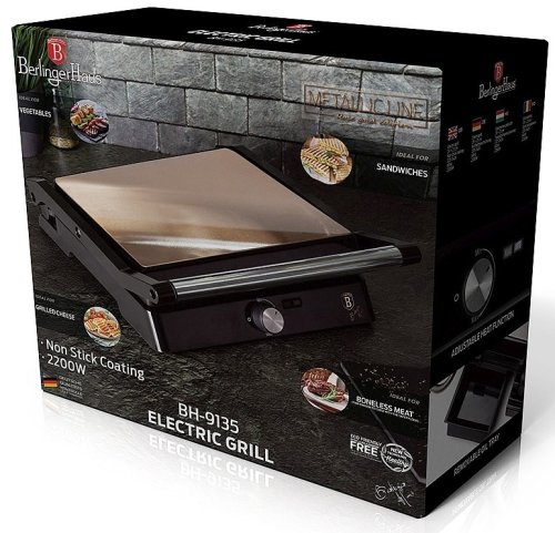 Elektrický domácí kontaktní gril z nerezové oceli - flexibilní použití, skvěle kombinuje stolní gril pro přípravu masa a panini gril na přípravu baget a sendvičů - ideální pro grilování masa, steaků, burgerů, párečků, zapékaných sendvičů, baget a panini - nepřilnavý povrch grilovacích desek zajistí, že se potraviny nepřipalují a navíc je velmi snadné povrch čistit - automatický světelný indikátor provozu - ochrana proti přehřátí - rukojeti sendvičovače zůstávají vždy chladné i během použití - vyjímatelná odkapávací zásuvka na tuk - výkon: : 2000 w - rozměry grilovací plochy: 29 x 23 cm - značka: berlingerhaus