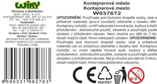 Kontejnerové město - 2 kontejnery. Velikost kontejneru 12,5 cm, auta 7 cm. Obsahuje 2 kontejnery, 2 kovová auta s volnými koly. Každý kontejner obsahuje 1 kovové auto, 2 budovy, 2 pouliční lampy, semafor, ulici, 2 figurky, polepy, obrázkový návod na sestavení. Více variant.