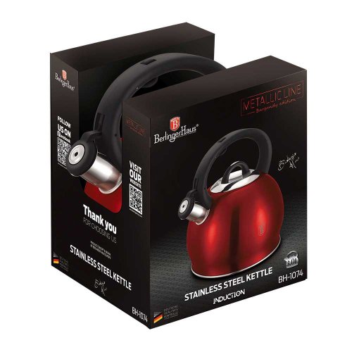 Pískací čajová konvice Berligerhaus Burgundy Metallic Line se vyrábí z nerezové oceli a hodí se pro všechny typy sporáků včetně indukce. Po odkrytí víka nalijete do konvice vodu. Otevírá se velmi snadno a zvládnete to jednou rukou. Necháte vodu ohřívat. Ve chvíli, kdy se voda začne vařit, vás na tento stav upozorní funkční píšťalka.