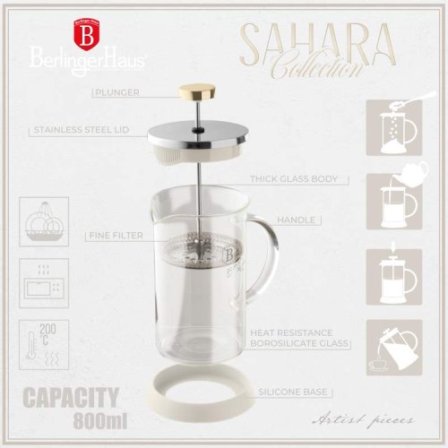 - French Press Sahara Collection od značky BerlingerHaus s objemem 0,8 litru- konvice typu French Press je vybavená odnímatelným filtračním pístem- jeho stlačením dochází k oddělení kávové nebo čajové …