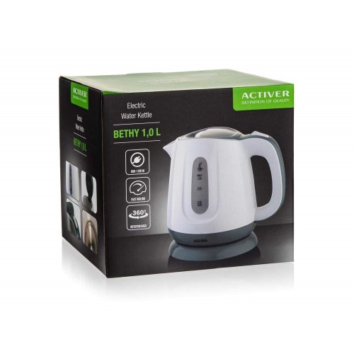 Varná konvice BETHY s plochým dnem z nerezové oceli, o objemu 1 l, je vhodná jak do každé kuchyně, tak i na cesty. Plastová v moderním designu s průhledovým ukazatelem množství vody a ochranou proti přehřátí. Základna se středovým konektorem - 360 stupňů, vyjímatelný filtr, automatické / manuální vypnutí a světelný indikátor provozu. Dodávána v bílo - šedé barvě.