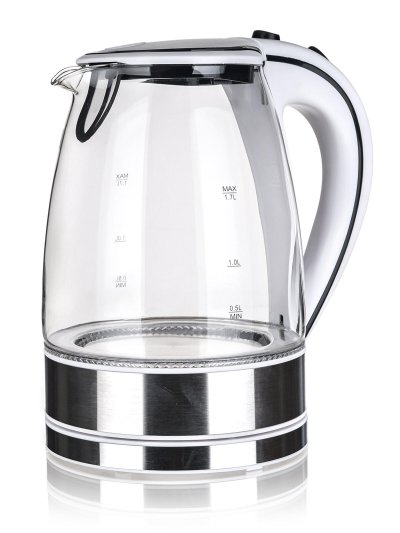 Moderní varná konvice s plochým dnem a skleněným tělem, o objemu 1,7 l, je nedílnou součástí každé kuchyně.