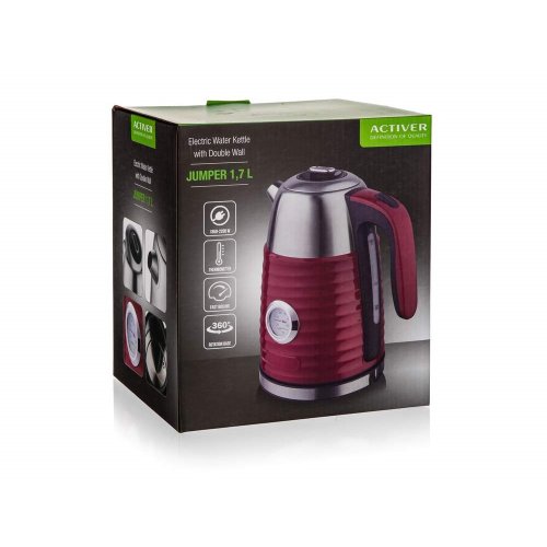 Moderní dvoustěnná varná konvice JUMPER s plochým dnem a nerezovým tělem, o objemu 1,7 l, je designovým doplňkem každé kuchyně. Pomocí analogového teploměru můžete sledovat teplotu vody. Konvice je vybavena ochranou proti přehřátí, má základnu se středovým konektorem - volně otočný o 360 stupňů, vestavěný filtr proti hrubým nečistotám a automatické / manuální vypnutí. Jedinečná dvoustěnná konstrukce zamezuje popálení při náhodném dotyku, udržuje uvařenou vodu déle teplou pro postupné odlévání. Zároveň v sobě kombinuje výhody vnitřní nerezové vrstvy a vnější plastové.