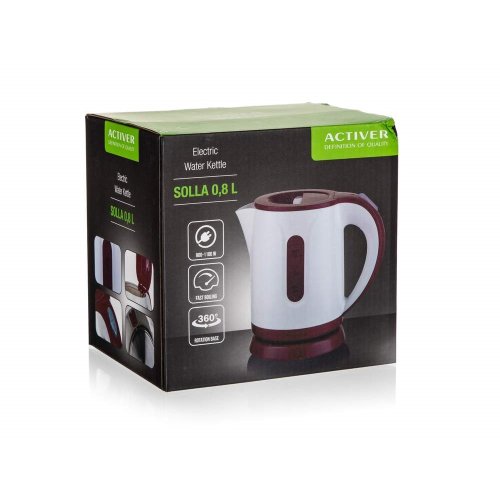 Varná konvice SOLLA s plochým dnem z nerezové oceli, o objemu 0,8 l, je nedílnou součástí každé kuchyně. Plastová v moderním designu s průhledovým ukazatelem množství vody a ochranou proti přehřátí. Základna se středovým konektorem - 360 stupňů, vyjímatelný filtr, automatické / manuální vypnutí a světelný indikátor provozu. Dodávána v bílo-bordó barevné kombinaci.