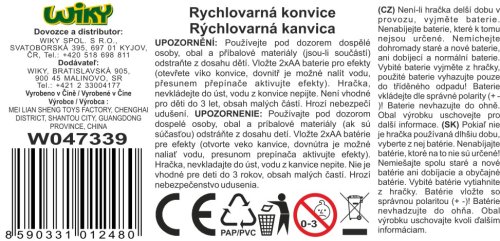 Konvice varná s efekty. Velikost 16 cm. Vydává světelné a zvukové efekty. Přesné rozměry 13x9x16 cm. Baterie 2xAA nejsou součástí balení.