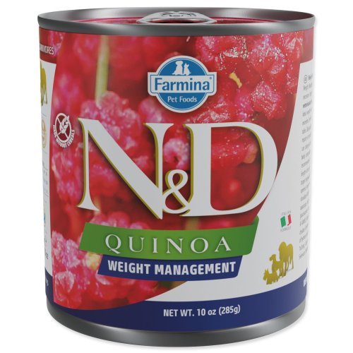 Kompletní vlhké krmivo pro dospělé psy. Farmina N&D Quinoa Weight Management je krmivo pro zvláštní účely výživy psů určené ke snížení nadměrné tělesné váhy.