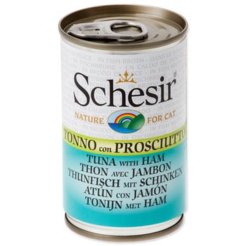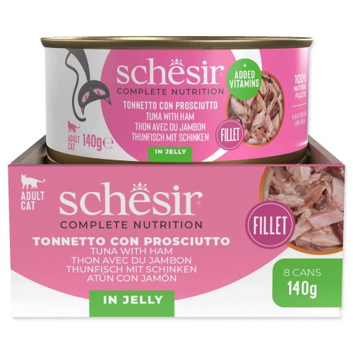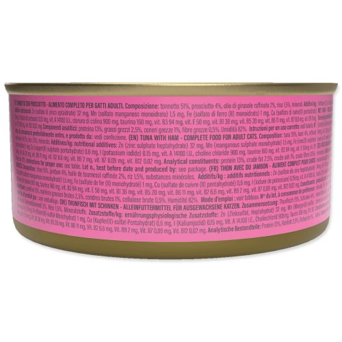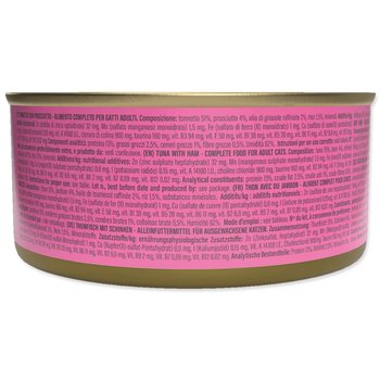 Konzerva s masem z tuňáka se šunkou v želé. Doplňkové krmivo pro dospělé kočky.