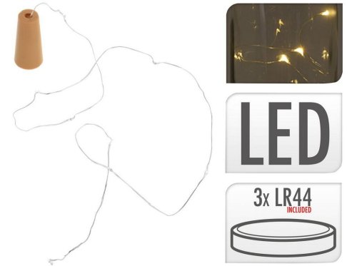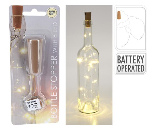 Zátka do lahve 8 LED Pasuje na jakoukoliv láhev Osvětlená část 75 cm LED v teplé bílé barvě Napájení 3x LR44 Baterky součást balení Pouze pro vnitřní použití