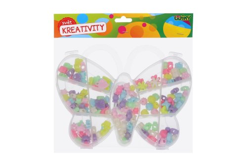 Korálkový set o hmotnosti 55g ve tvaru motýla. 13 různých druhů korálků + provázek.