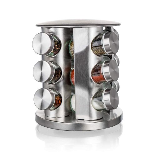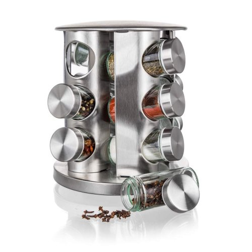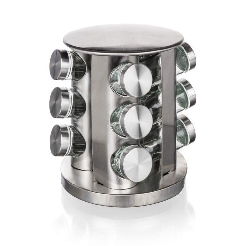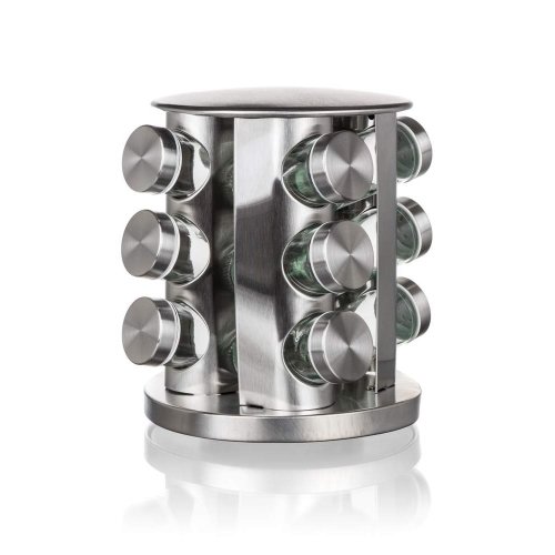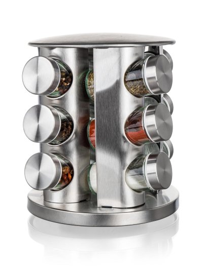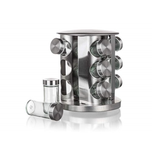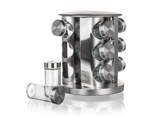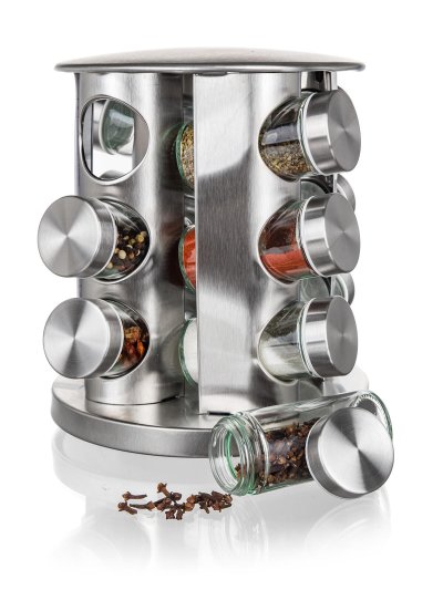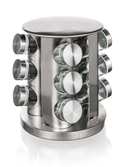 sada kořenek Akcent obsahuje: 12 x skleněná kořenka s plastovým víčkem 1 x otočný nerezový stojánek 21 x 23 cm