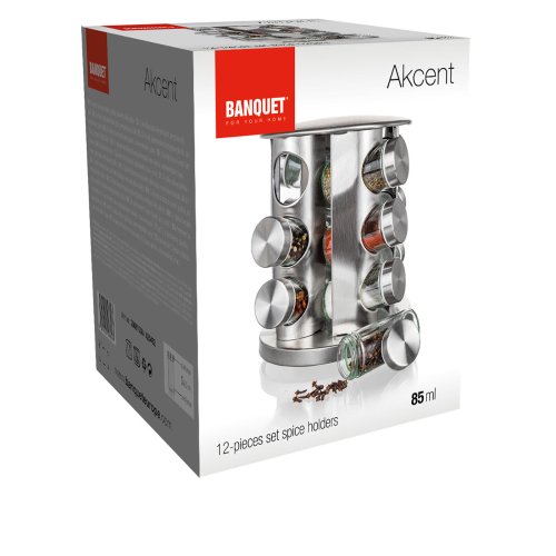 Sada kořenek AKCENT obsahuje 12 skleněných kořenek s plastovým víčkem. Praktický otočný stojan je vyroben z nerezové oceli a plastu. Vhodné do myčky na nádobí (bez víčka).