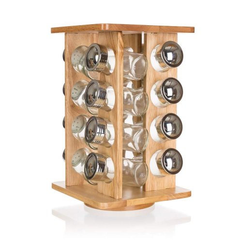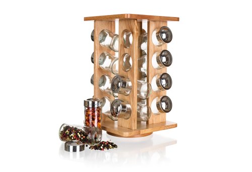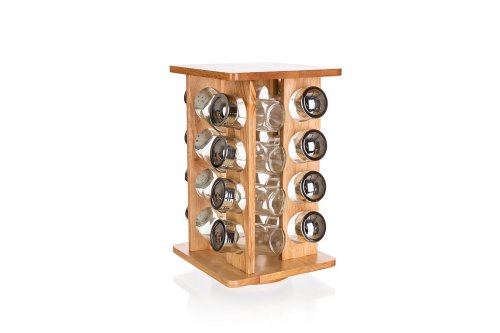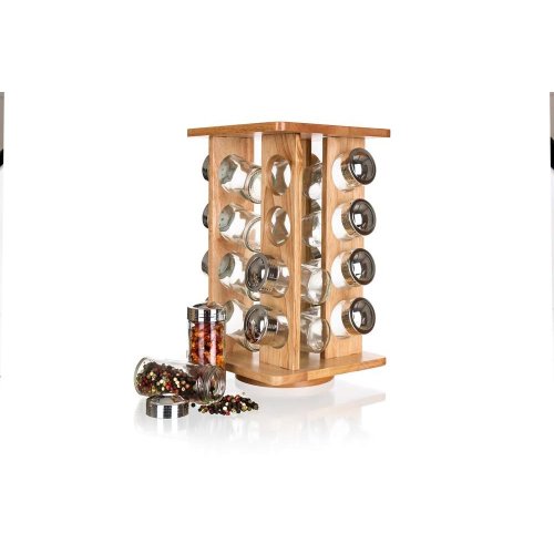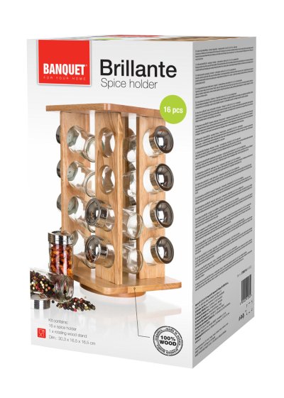 sada kořenek Brillante obsahuje: 16 x skleněná kořenka s plastovým víčkem a chromovou povrchovou úpravou 1 x otočný dřevěný podstavec o rozměrech 16,5 x 16,5 x 30,3 cm