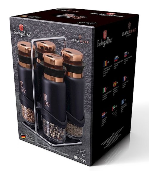 materiál: nerezová ocel / sklo - sada obsahuje: stojan, 4x kořenka - objem kořenky: 120 ml - nastavitelná velikost otvoru - stojánek lze díky promyšlené základně pohodlně přemisťovat