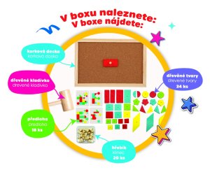 Dřevěné tvary, kladívko, hřebíčky a deska z korku – to je výtvarná klasika, která děti nejen zabaví, ale i rozvíjí! Malí stavitelé si mohou vytvářet vlastní obrázky nebo skládat podle přiložených předloh.