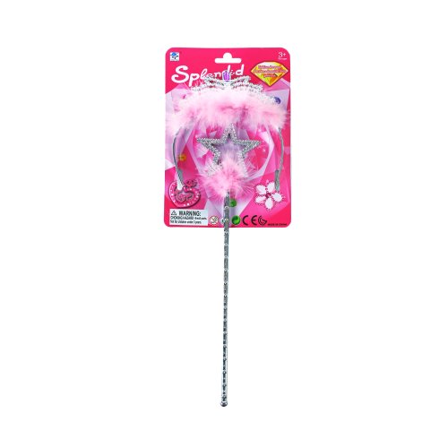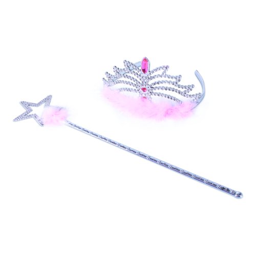 Exkluzivní sada pro princezny! Tato stylová souprava stříbrné barvy obsahuje oslnivou korunku s barevnými kamínky a žezlo. Vše je dekorováno ozdobným peřím růžové barvy. Obohať svůj kostým princezny o tyto nádherné doplňky!