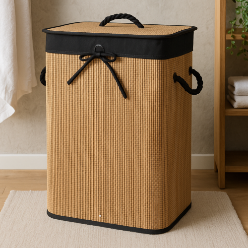 Koš na prádlo z bambusu – přírodní design s kontrastními detailyPraktický a elegantní koš na prádlo vyrobený z kvalitního bambusu (Phyllostachys heterocycla), ideální pro moderní i rustikální interiéry.Specifikace:• …
