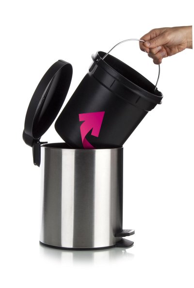 Odpadkový koš SOLISTE v nerezovém provedení. Má matný povrch, plastové víko a vnitřní vyjímatelnou nádobu na odpad. Koš má nášlapný systém na otevírání víka pro hygienickou manipulaci.
