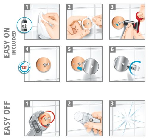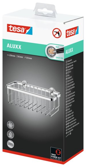 Poličky do sprchy s patentovanou technologií tesa® Power.Kit (univerzální montážní řešení pomocí lepidla) Pochromovaný hliník s vysokým leskem, zaoblené provedení, kruhové nástěnné podložky Spolehlivé …
