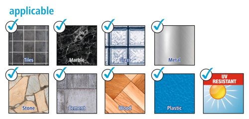 Funguje na obkladech, kovu, přírodním kameni, mramoru, betonu, dřevu, sklu a mnoha druzích plastů