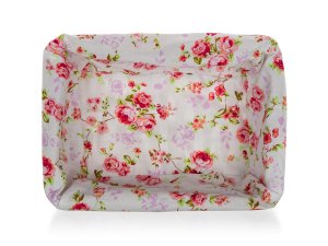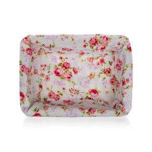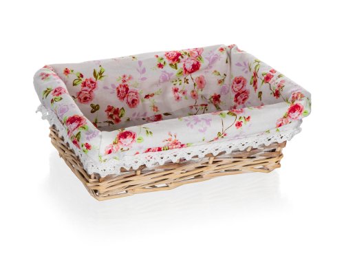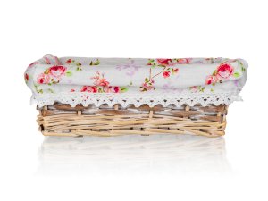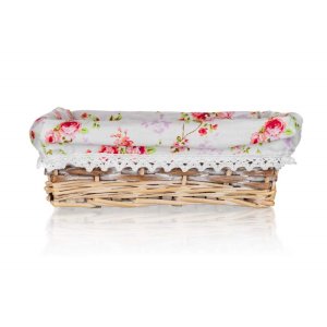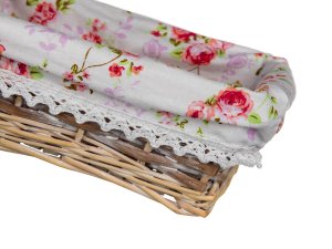 Proutěný košík ROSES je vhodný pouze pro dekorativní účely. Dodáván v hnědobílé barvě obdelníkového tvaru, uvnitř bavlněná látka s motivem růží a krajkovým lemem.