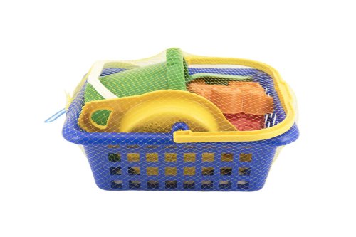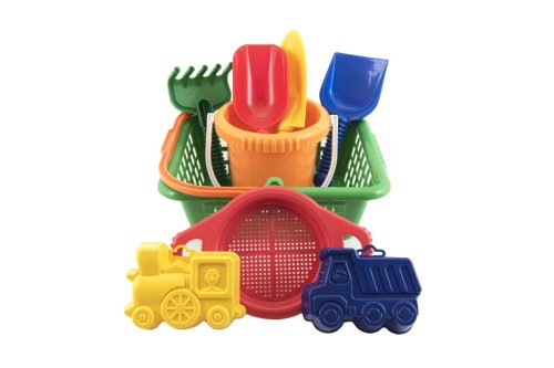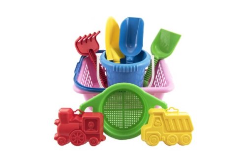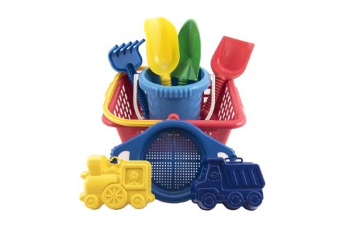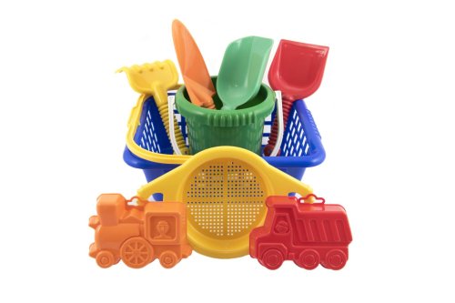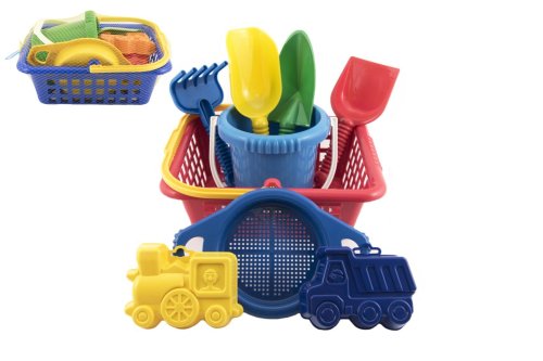 Sada na písek. Sada obsahuje košík, kyblík, 2 bábovky, rýč, lopatku a sítko. Vhodné od 12 měsíců.
