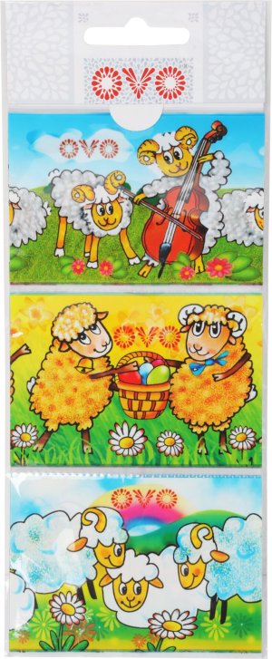 Jarní motivy smršťovacích fólií ve stylu hravých beránků.
