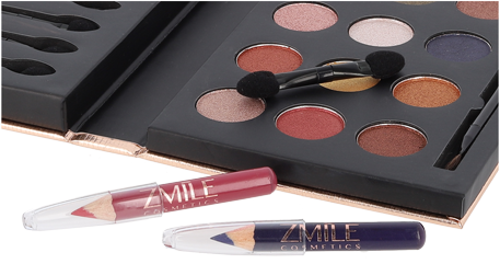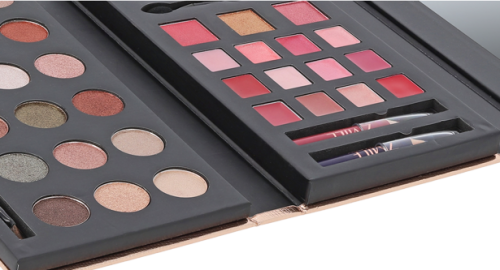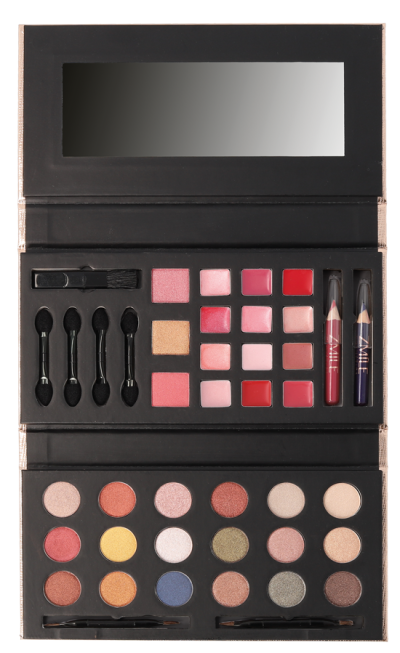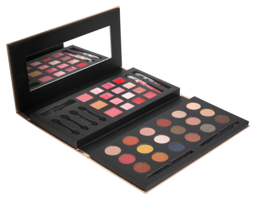 Kosmetická paleta rozkládací ‚Glam To Go‘ – ve dvou patrech obsahuje 18× oční stíny, 12xkrémovou rtěnku, tvářenku, bromzový pudr, 1xoční tužku, 1xtužku na rty, 1xaplikátor a integrované zrcátko. Dermatologicky testováno, vyhovuje přísným normám EU.