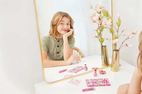 Připravte své nehty na růžový lak pomocí květinového pilníku a doplňte jej nálepkami na nehty. Doplňte svůj květinový vzhled pomocí lesku na rty, paletky očních stínů a kosmetického štětce. Věk od 8+.
