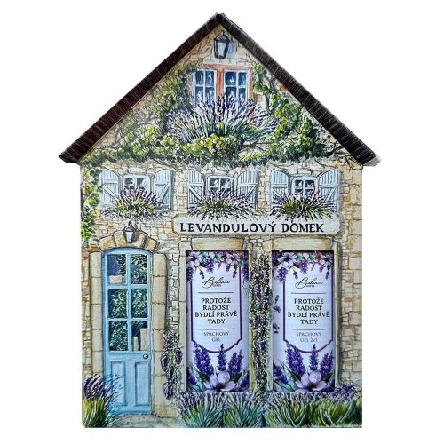 Kosmetická sada Levandulový domek obsahuje sprchový gel 100 ml a sprchový gel 2v1 s bylinnými extrakty a vůní levandule. Obal má tvar domečku s ručně kreslenou grafikou.